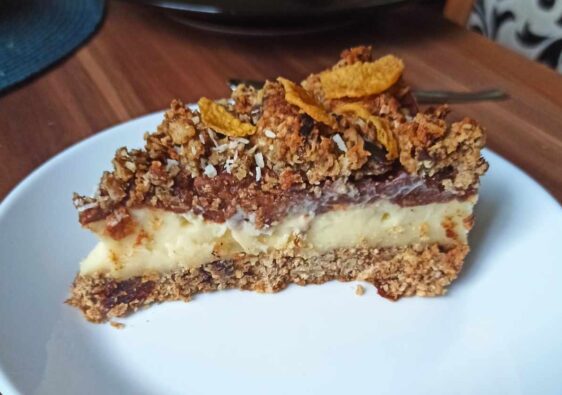 Czekoladę kroimy na drobne kawałki i dorzucamy do przygotowanej masy. Mieszamy widelcem.